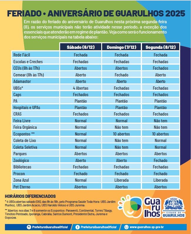 Em razão do feriado do aniversário de Guarulhos nesta próxima segunda-feira